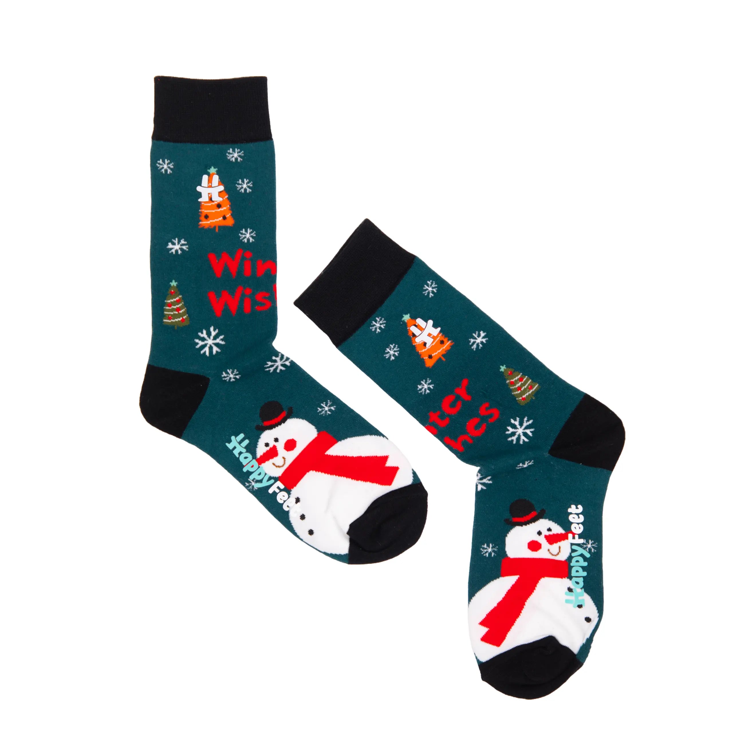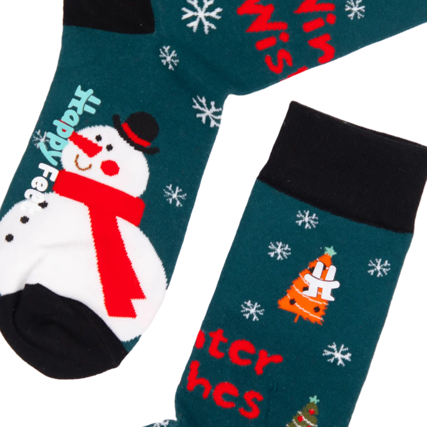 Celebrate the cosy charm of the season with our Snowman Swagger Socks, part of the Happy Feet Christmas Collection. Designed in a rich teal base with playful snowflakes, festive Christmas trees, and a cheerful snowman sporting a bright red scarf, this pair brings winter magic to every step.